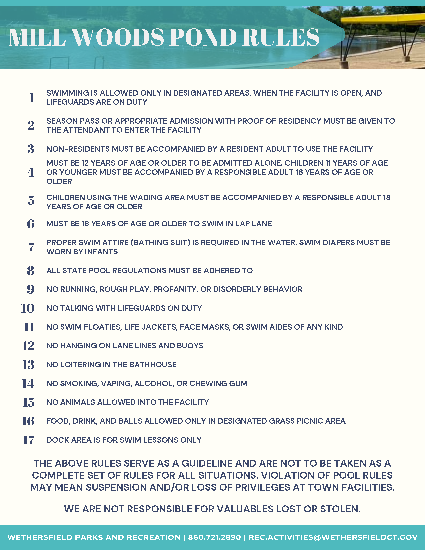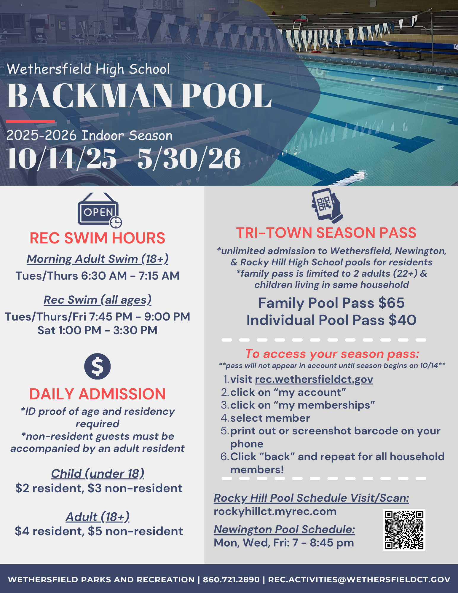 - Unlimited admission to Wethersfield, Newington, and Rocky Hill High School pools