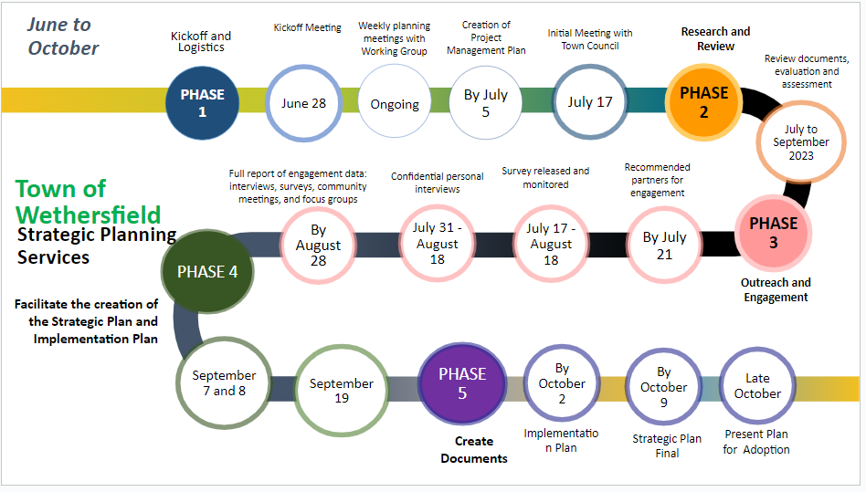 The Strategic Plan will set the vision for the Town over the next few decades and provide a clear set of short- and long-term priorities to accomplish that vision. A survey has been created to capture what residents feel are the major priorities in creating this future. We encourage all residents to take 10 to 15 minutes to complete the survey and give us your thoughts on Wethersfield's future. Please spread the word to your neighbors as well.